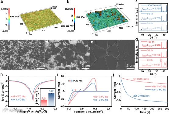 在(a)含有和(b)不含CYC-Na添加剂的电解液中循环20次后的锌负极的CLSM图。在含有CYC-Na电解液中经过(c) 20次,(d) 50次和(e) 100次循环后的锌表面的SEM图。(f)不含和(g)含有CYC-Na的电解液中经过20、50和100次循环后的锌阳极的XRD图谱。(h)含有和不含CYC-Na的电解液的Tafel图。误差条(标准偏差)基于至少三组数据计算。(i)使用含有和不含CYC-Na的电解液的Zn||Cu电池的CV曲线。(j)使用含有和不含CYC-Na的电解液的Zn||Zn对称电池的CA结果。