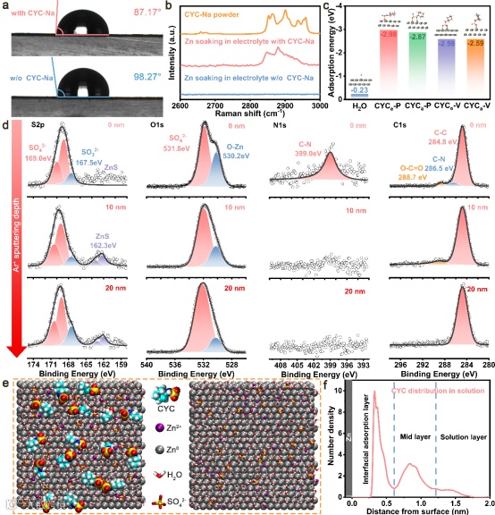(a) 不同电解质的接触角测试。(b) CYC-Na粉末和浸泡在不同电解质中5天的Zn箔表面的拉曼光谱。(c) 不同分子的吸附能,P和V分别表示平行和垂直于表面。(d) CYC-Na电解质中Zn负极经过50个循环后的S2p、O1s、C1s和N1s的深度剖面XPS。(e) Zn(002)表面溶液分子动力学模拟的顶部视图,左侧为CYC-Na,右侧为不含CYC-Na。(f) 通过MD模拟获得的溶液中对应的CYC分布。