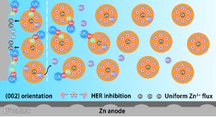 ▲表面层和中间层CYC分布多,且分子的溶剂化程度很高;分散层CYC分布很少,溶剂化程度也很低。通过电荷平衡与原子钉扎的共同作用,CYC在表面形成局部高浓度。通过表面吸附与局部溶剂化的协同作用,CYC切断了表面水的氢键网络,抑制HER和SO42-分解,并均匀化锌离子通量。