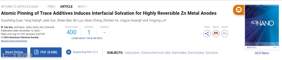 Guosheng Duan, Yang Wang*, Leilei Sun, Zhean Bao, Bin Luo, Sinan Zheng, Zhizhen Ye, Jingyun Huang*, and Yingying Lu*. Atomic Pinning of Trace Additives Induces Interfacial Solvation for Highly Reversible Zn Metal Anodes, ACS Nano