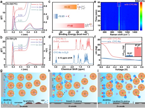 (a) 模型在不同层的Zn-O(CYC)和(b) Zn-O(H2O)的RDF。(c) H2O–CYC(SO3)、Zn–H2O 和 Zn–CYC(SO3) 的结合能。(d) 纯D2O和ZnSO4溶液中CYC-Na的液态1H NMR谱。(e) 镀锌过程中含CYC-Na添加剂的电解液的原位拉曼光谱。(f) 单循环CV测试下EQCM的质量变化,误差线(标准差)是根据至少三组数据计算的。本工作拟议机制示意图:(g) 不含 CYC-Na 的电解质;(h) 含有微量 CYC-Na 的电解质;(i) 含有大量CYC-Na的电解液。