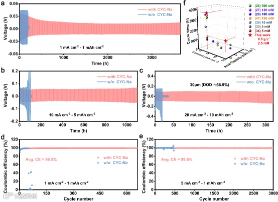 在(a)1 mA cm-2 ,1 mAh cm-2 和(b) 10 mA cm-2 , 5 mAh cm-2 条件下,Zn||Zn对称电池在含有和不含CYC-Na的ZnSO4电解液中的长循环性能。c) 使用30μm Zn箔在20 mA cm-2 , 10 mAh cm-2 条件下的放电深度测试。(d) 在1 mA cm–2和(e) 5 mA cm–2的电流密度以及1 mAh cm–2的容量下使用不同电解液组装的Zn||Cn不对称电池的CE比较。(f) 与最近报道的研究进行了比较。