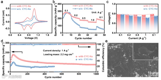 (a) 扫描速率为0.1 mV s–1时的CV曲线。(b) 0.1至1 A g–1范围内不同电流密度的倍率性能和(c) 相应的放电电压平台。(d) 电流密度为1 A g–1时的长期循环性能,(e) 在CYC-Na电解液中循环1000次后负极的SEM图。