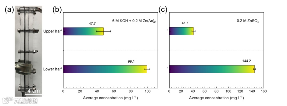 图3. 碱性(b)和弱酸性(c)锌对称电池运行后上下部电解液锌元素浓度。