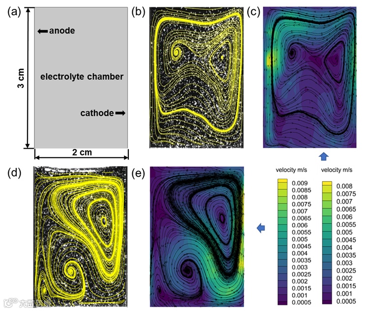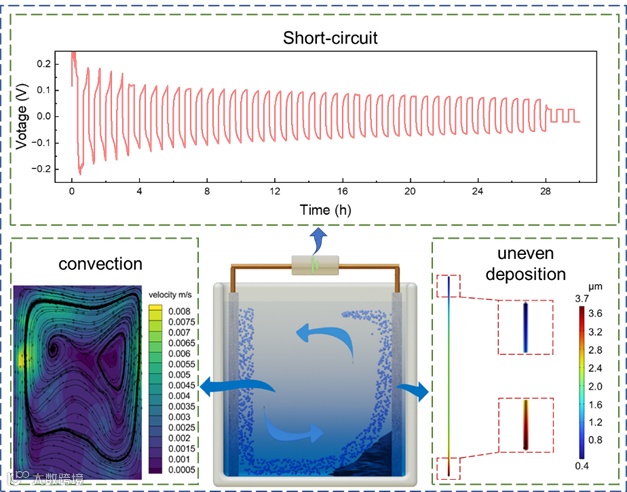 图1. 由于不均匀沉积导致的锌对称电池短路,粒子示踪实验证明了存在自然对流以及加入重力场后产生底部沉积的锌对称电池模拟。