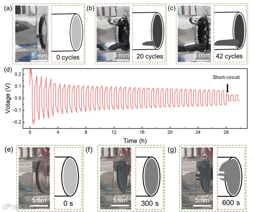 图6. 循环过程中电极上下部厚度的差异以及电极厚度变化导致的短路模拟。
