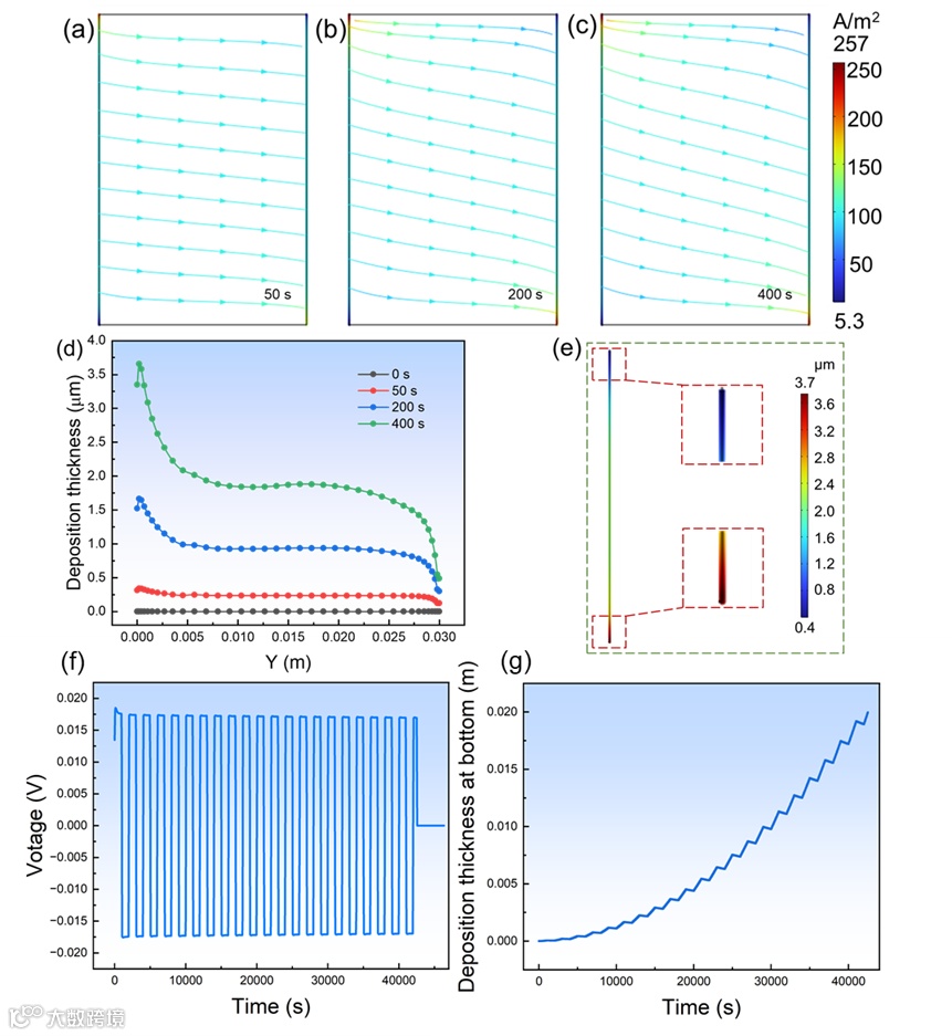 在模拟中加入重力场,离子浓度差异引起电极上下部厚度差异,最终下部厚度逐渐增大引起短路。
