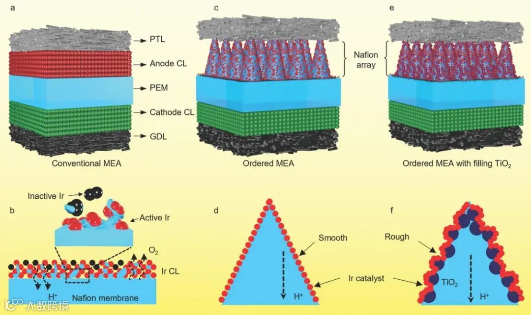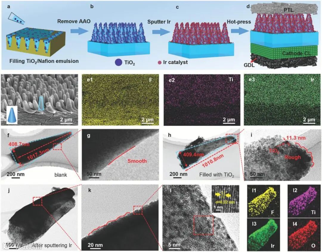 掺杂纳米 TiO2颗粒构建具有高稳定性结构、扩大界面和超低 Ir 负载的杂化三维有序化膜电极 (MEA)用于质子交换膜电解水
