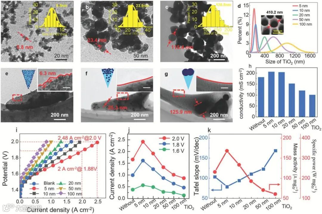 图3. 掺杂TiO2粒径杂化Nafion阵列和相对应的杂化有序化膜电极的影响