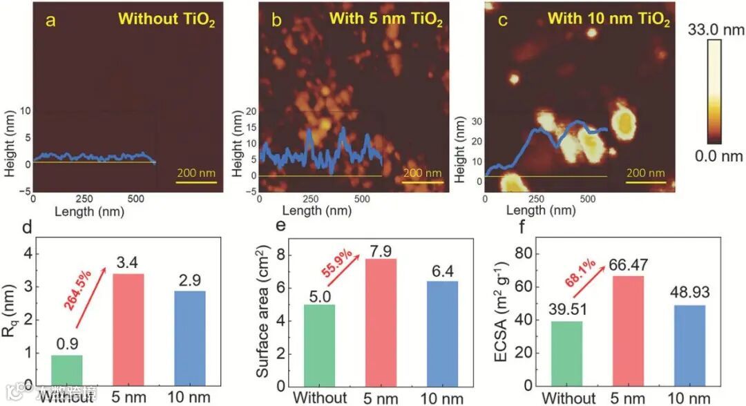 由于不同尺寸的TiO2将会造成不同的掺杂结果,进而影响杂化有序化膜电极在PEMWE中的性能。本工作通过TEM和激光粒度仪,对TiO2的尺寸进行了非原位和原位的分析。结果表明,小尺寸的TiO2能够良好的分散在阵列中,且会使得阵列形成粗糙表面,增大了Nafion阵列的表面积;中尺寸的TiO2能够掺杂到阵列中,但是对于阵列表面影响较小;大尺寸的TiO2则完全不能掺杂到阵列中(图2)。如图3所示,杂化Nafion阵列的表面粗糙度和表面积相比于未掺杂的分别提高了264.5%和55.9%。这一优势在PEMWE上得到了良好的印证。在Ir催化剂负载量极低的情况下,杂化有序化膜电极的最大电流密度能够达到2.48 A cm-2@2 V,质量活性高达172.2 A mgIr−1。因此,这种杂化有序化膜电极能够显著降低催化剂载量,提高PEMWE的性能。
