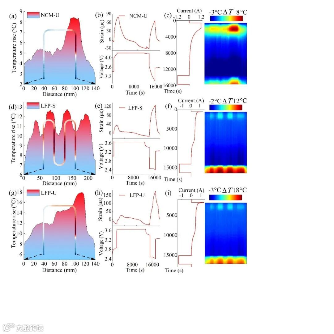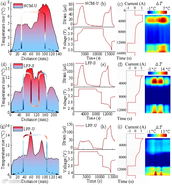 近期,同济大学汽车学院王秀武博士(第一作者)、朱建功副教授(通信作者)和戴海峰教授(通信作者),创新性提出一体化功能极片的设计方案,并选择光纤作为传感器进行植入验证,实现了锂电池的无损原位温度监测。该工作基于光频域反射技术(OFDR),测量了锂电池在初始状态(BoL)和老化状态(EoL)的内部温度演变和二维分布。基于一体化功能极片技术,在磷酸铁锂(LFP)和三元(NCM523)两种材料体系的Ah级软包电池中进行验证,并设计了两种不同的光纤布局方式(S型和U型)进行锂电池内部温度分布式测量。