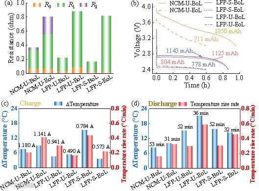 基于上述实验,我们首次完成了锂电池的无损植入和全生命周期的电化学性能测试,并获取了电池在循环初期和老化后的温度演变规律和温度分布。通过循环容量、阻抗和半电池测试,验证了我们提出的植入方案不会影响电池的电化学性能。通过拆解表征和组件形貌分析,验证了传感器的防腐设计,并证实一体化功能极片的设计不会导致极片析锂、活性材料损失等不良影响。同时,我们证明了老化电池在放电阶段温度快速上升,需要重点关注。