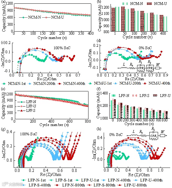 图 2 NCM和LFP电池组的电化学性能对比。(a) NCM电池组1C倍率长循环容量曲线;(b) NCM电池组在不同循环次数后的标定容量;(c-d) 有植入和无植入的NCM软包电池的阻抗图谱。(e) LFP电池组1C倍率长循环容量曲线;(f) LFP电池组在不同循环次数后的标定容量;(g-h) 有植入和无植入的LFP软包电池的阻抗图谱。