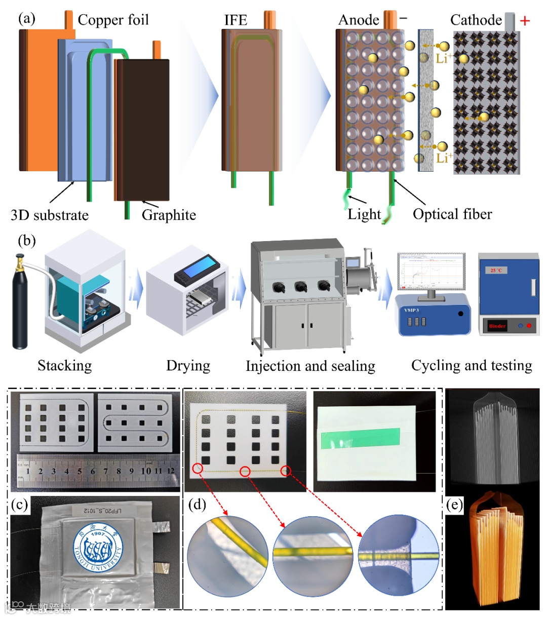 随着大容量、高性能的电池的应用,传统的电池管理系统缺乏对电池内部状态信息的有效监测,从而造成管理不足。而传感器植入造成的电池性能损伤、电池内部的复杂电化学环境是制约锂电池内部信息监测的瓶颈问题。通过一体化功能极片的设计,我们实现了无损植入并可分布式原位测量电池内部信息。我们利于光纤传感器成功监测了锂电池内部的温度演变和二维分布,并对使用一体化功能极片的电池进行全生命周期的电化学性能测试。