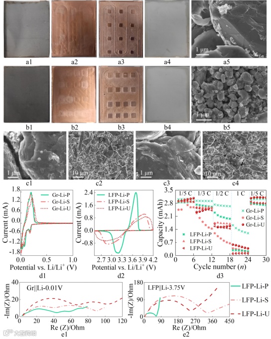 图 3 LFP -S和LFP-U在循环老化后的拆解组件光学照片、半电池测试结果。