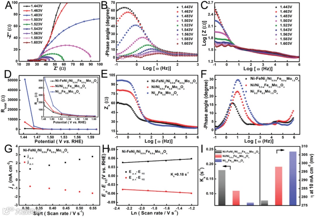 图4. Ni-FeNi3/Ni0.5-bFe0.5-yMo1.5Ox在不同电位下的(A)Nyquist 曲线和(B,C)Bode 曲线;Ni-FeNi3/Ni0.5-bFe0.5-yMo1.5Ox、 Ni/Ni0.5-aFe0.5Mo1.5Ox和 Ni0.5Fe0.5Mo1.5Ox 电极的(D)不同电位下的 Rtotal和(E, F) 固定电位下的 Bode 曲线;Ni-FeNi3/Ni0.5-bFe0.5-yMo1.5Ox的(G)Laviron 分析(jp vs. 𝜐-1)和(H)异相电子速率常数(Ks);(I)Ni-FeNi3/Ni0.5-bFe0.5-yMo1.5Ox、 Ni/Ni0.5-aFe0.5Mo1.5Ox和 Ni0.5Fe0.5Mo1.5Ox的(E)Ks和η10比较图。