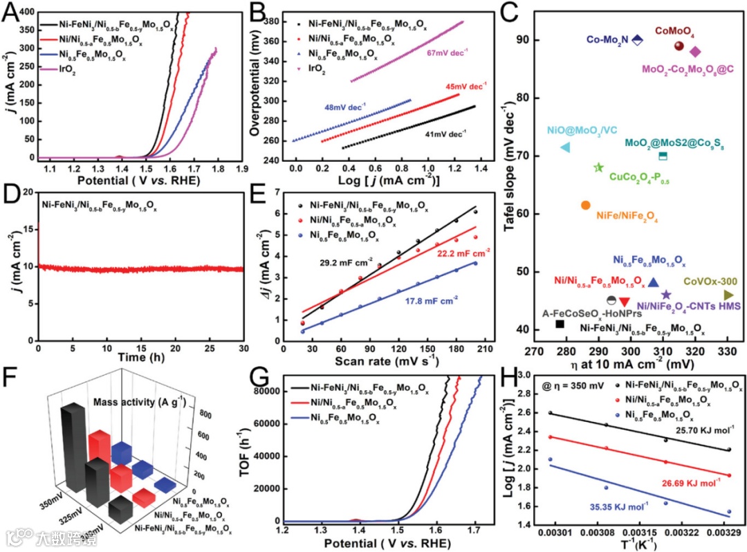 图3. Ni-FeNi3/Ni0.5-bFe0.5-yMo1.5Ox、 Ni/Ni0.5-aFe0.5Mo1.5Ox和 Ni0.5Fe0.5Mo1.5Ox的(A) OER 极化曲线和(B)Tafel 斜率;(C)Ni-FeNi3/Ni0.5-bFe0.5-yMo1.5Ox与其它 OER 电催化剂的性质比较图和(D)Ni-FeNi3/Ni0.5-bFe0.5-yMo1.5Ox的稳定性测试。Ni-FeNi3/Ni0.5-bFe0.5-yMo1.5Ox、 Ni/Ni0.5-aFe0.5Mo1.5Ox和 Ni0.5Fe0.5Mo1.5Ox的(E)电容电流随扫速变化的关系曲线,(F)MA,(G) TOF和(H)Ea值。