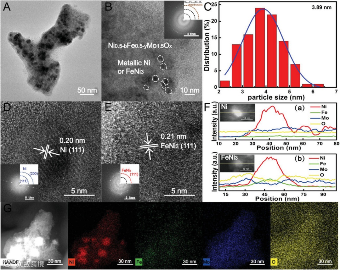 图2. Ni-FeNi3/Ni0.5-bFe0.5-yMo1.5Ox的(A, B) TEM,(C) 尺寸分布图,(D, E) HRTEM(插图为对应的 SAED 图),(F)不同区域的元素线扫和(G)元素 Mapping 图。