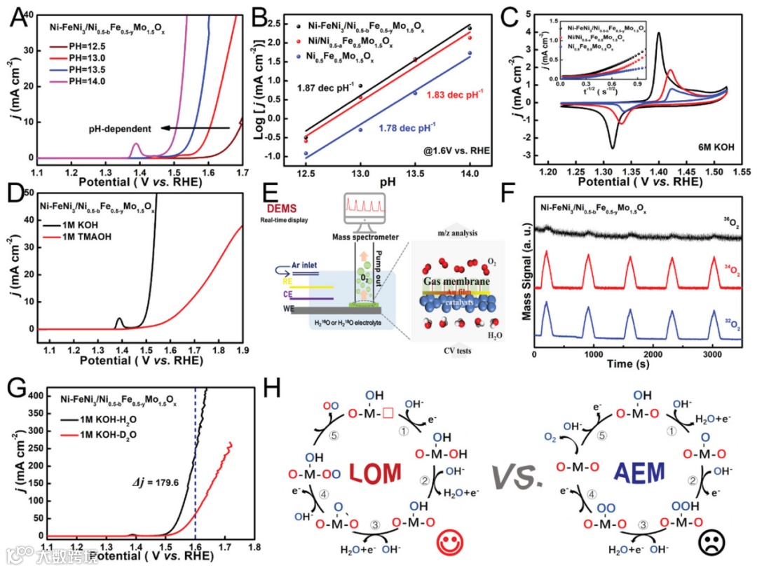 图5. (A)Ni-FeNi3/Ni0.5-bFe0.5-yMo1.5Ox在不同 pH 的 KOH 中测试的 OER 极化曲线;Ni-FeNi3/Ni0.5-bFe0.5-yMo1.5Ox、 Ni/Ni0.5-aFe0.5Mo1.5Ox和 Ni0.5Fe0.5Mo1.5Ox的(B) Δlog(i) vs. pH 曲线和(C)在 Ar 饱和的 6M KOH 中测得的CV 曲线;(D)Ni-FeNi3/Ni0.5-bFe0.5-yMo1.5Ox在 1 M KOH 和 1 M TMAOH 中的 OER 极化曲线;(E)DEMS测试装置图;(F)Ni-FeNi3/Ni0.5-bFe0.5-yMo1.5Ox的DEMS测试信号曲线;(G)Ni-FeNi3/Ni0.5-bFe0.5-yMo1.5Ox在 1 M KOH(H2O)和 1 M KOH(D2O)中的 OER 极化曲线;(H)AEM和LOM机制反应路径对比图。
