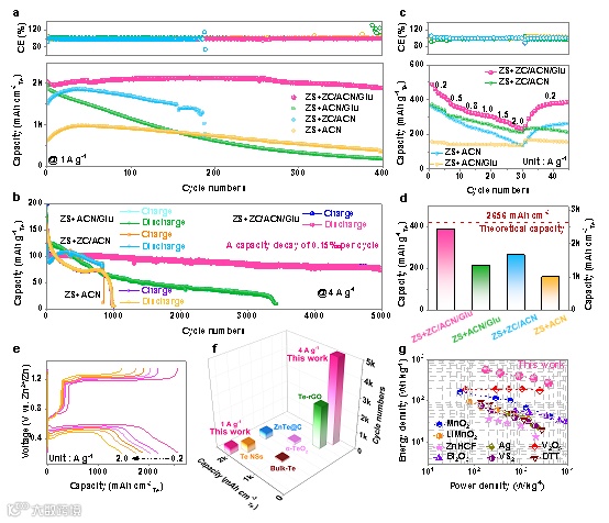 图2. Nano-Te电极在基于不同电解质的水系Zn‖Te电池中的电化学性能:a) 在1 A g-1电流密度下长循环的放电容量和库伦效率;b) 在4 A g-1大电流密度下的长循环性能;c) Zn‖Te电池在四种电解质中的倍率测试;d) 不同电解质中Zn‖Te电池的质量/体积比容量对比;e) 基于ZS+ZC/ACN/Glu,Zn‖Te电池在不同电流密度下的GCD曲线;f) 基于ZS+ZC/ACN/Glu的Zn‖Te电池与其他电池体系的体积比容量和循环寿命比较;g) Ragone曲线。