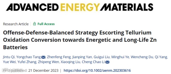 and Cheng Chao Li*. Offense-Defense-Balanced Strategy Escorting Tellurium Oxidation Conversion towards Energetic and Long-Life Zn Batteries. Adv. Energy Mater. 2023, DOI: 10.1002/aenm.202303616.