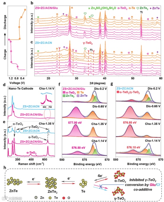 图4. Glu/Cl-共调控剂对Te转化的调控机理:a) Zn‖Te电池的恒流充放电曲线;Zn‖Te电池在b) ZS+ZC/ACN和c) ZS+ZC/ACN/Glu中不同充放电电位下的XRD图谱;Nano-Te阴极在充电到d) 1.14 V(Cha-1.14V)和e) 1.35 V(Cha-1.35V)中的拉曼光谱;f-g) Nano-Te阴极在不同电解液中被充放电到不同电位下的Te 3d XPS谱图;h) 在不同电解液中Te转化过程的示意图。