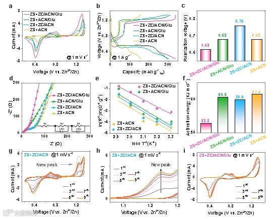 图3. 不同电解质对Zn‖Te电池中Nano-Te阴极电化学性能的影响:a)不同电解质中Zn‖Te电池的CV曲线(1 mV s-1);b)在1 A g-1下,不同电解质下Zn‖Te电池的恒流充放电曲线;c)Zn‖Te电池在不同电解质中的极化电压;d)不同电解质中Zn‖Te电池的EIS图谱 ;e)Rct倒数的对数值与绝对温度倒数之间的线性关系;f)Zn‖Te电池在不同电解质中的活化能 ;Zn‖Te电池在g-h) ZS+ZC/ACN和i) ZS+ZC/ACN/Glu在1 mV s-1下的CV曲线。