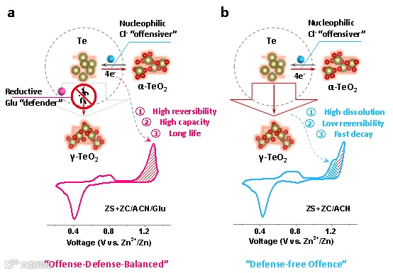 示意图1. 基于不同电解液的水系Zn‖Te电池中Te转化调控策略:a)攻守兼备电解液(ZS+ZC/ACN/Glu);b)攻守失衡电解液(ZS+ZC/ACN)