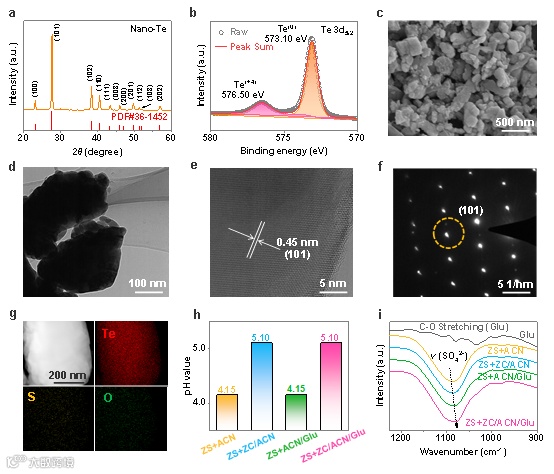 图1. 正极材料和电解质的表征:a) XRD图谱和b) Nano-Te的Te 3d XPS谱图;c) SEM图像;d,e) Nano-Te的TEM和HR-TEM图像;f) e中HR-TEM图像对应的SAED图谱);g) HAADF图像和相应的EDS元素mapping,包括Te、S、O元素;h) ZS+ACN、ZS+ZC/ACN、ZS+ACN/Glu、ZS+ZC/ACN/Glu的pH值;i) Glu和四种电解质的FT-IR红外光谱图。