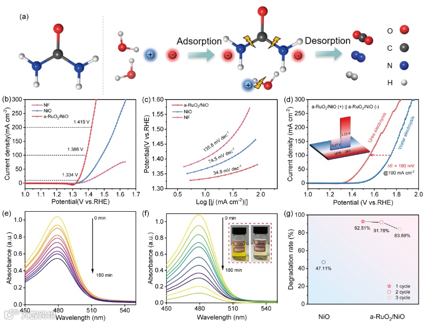 图4. (a)尿素反应示意图。(b) a-RuO2/NiO及其对照样品在含0.33 M尿素的1 M KOH中95% ir校正极化曲线。(c) a-RuO2/NiO、NiO和NF的Tafel曲线。(d)尿素电解极化曲线(1 M KOH + 0.33 M尿素)与a-RuO2/NiO为正极和负极的水电解极化曲线(1 M KOH)的比较(插入图为电解系统在1 M KOH和不含0.33 M尿素时在10 mA cm−2下所需的电压直方图)。(e, f)尿素降解(0 ~ 180 min,间隔20 min)过程中NiO和a-RuO2/NiO的紫外光谱分析。(g)电流密度为100 mA cm−2时的尿素降解率和对应的可回收性能。