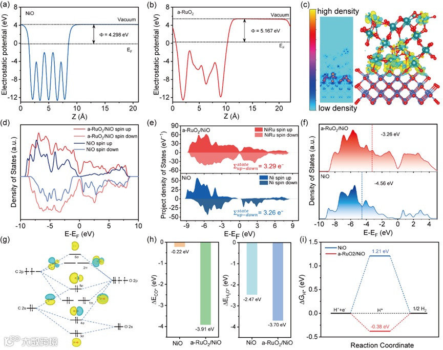 图5. (a) NiO(110)表面和(b)无定形RuO2(100)表面的静电电位。(c) a-RuO2/NiO局部电荷密度变化的等值面,其中黄色和青色区域表示电子积聚区和耗尽区。(d)计算NiO和a-RuO2/NiO的DOS。(e) NiO和a-RuO2/NiO中金属轨道的投影态密度(PDOS)。(f) NiO和a-RuO2/NiO中金属d轨道的态投射密度。虚线表示DFT估计的d波段中心。(g) CO分子轨道图和能级图。(h) CO分子(ΔECO*)(左)和H2O分子(ΔEH2O*)(右)在NiO和a-RuO2/NiO表面的吸附自由能。(i) NiO和a-RuO2/NiO在不同活性位点上的吉布斯自由能(ΔGH*)图。