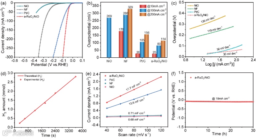 图3.(a) NiO、NF、Pt/C和a-RuO2/NiO在1m KOH下的线性扫描伏安(LSV)曲线(95% iR补偿)。(b)这些催化剂在不同电流密度下相应的过电位。(c)塔菲尔斜坡。(d)通过实验测量和理论计算确定的a-RuO2/NiO的析氢。(e)催化剂双层电容(Cdl)。(f) a-RuO2/NiO电极在1 M KOH溶液中以10 mA cm−2电流密度进行时电位测定试验。