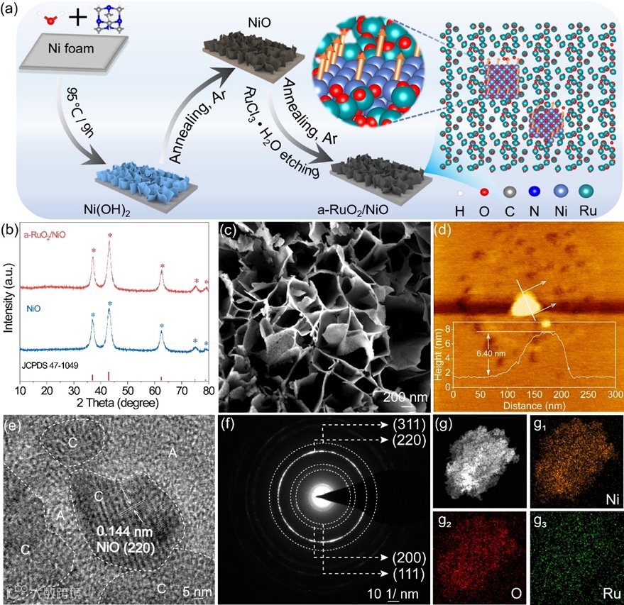 从X射线衍射(XRD)观察到的衍射峰可归为NiO(JCPDS no. 47-1049)引入Ru后在a-RuO2/NiO的XRD谱图中没有发现RuO2或Ru的附加特征峰,表明RuO2/Ru应该是无定形的。透射电子显微镜(TEM)和扫描电子显微镜(SEM)图像显示具有丰富的非晶RuO2/晶型NiO界面。原子力显微镜(AFM)图像表明a-RuO2/NiO纳米片的厚度约为6.4 nm。高角度环形暗场扫描TEM (HAADF-STEM)图像和TEM-eds图谱进一步证实了Ni、O和Ru元素在纳米片上的均匀分布。