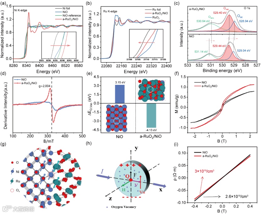 图2. (a) Ni K-edge和(b) Ru K-edge归一化XANES光谱。(c) O - 1s对NiO和a-RuO2/NiO的XPS光谱。(d) NiO和a-RuO2/NiO的x波段EPR谱。(e) NiO和a-RuO2/NiO表面氧空位形成能。(f) NiO和a-RuO2/NiO样品的磁滞回线,表明磁化强度增强。(g) a-RuO2/NiO中氧空位介导的自旋极化示意图。(h)制备NiO和a-RuO2/NiO的代表性霍尔测量。(i)室温下霍尔电阻率ρ随磁场B的变化,得到不同载流子浓度的NiO和a-RuO2/NiO样品。