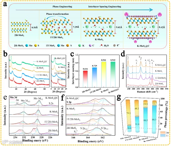 图2 (a)从 2H-MoS2 到 K-MoS2@C 的层间距和相结构调控示意图;(b-d) 2H-MoS2、1T/2H-MoS2、K-MoS2 和 K-MoS2@C 的 XRD、Raman 图谱 ; (e-g) XPS 光谱。