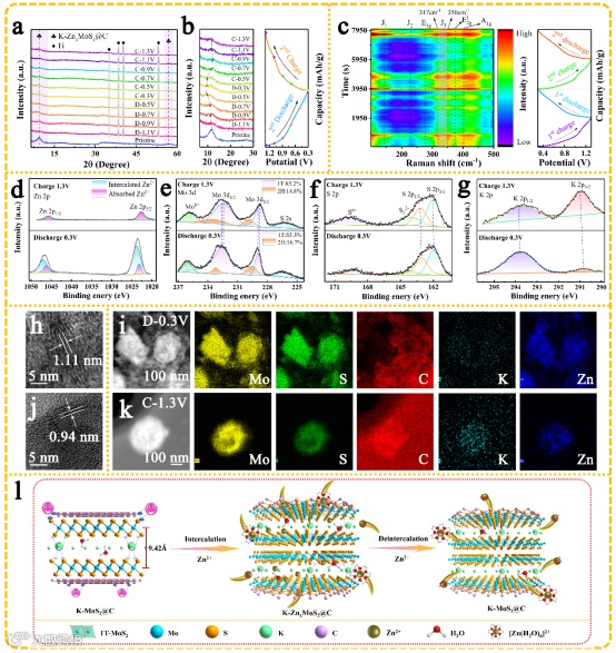 图6 (a-b)不同电位下的非原位XRD图谱;(c)第二次充放电循环过程中的原位Raman光谱;(d-g)完全充放电下的非原位XPS图谱;(h-k)完全充放电下的非原位TEM图谱;(l) K-MoS2@C纳米花电极的反应机理示意图。