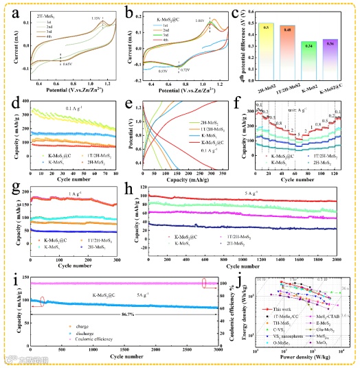 通过CV曲线氧化还原峰之间的峰位差,证明了K+的引入对氧化反应活性的改善。K-MoS2@C在1 A g-1下具有153 mAh g-1的比容量,在5 A g-1下经过3000次循环容量保持为86.7%,展示出高的可逆比容量、杰出的倍率性能和优异的循环稳定性。