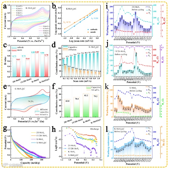 图5 (a-f)MoS2基电极材料的动力学分析;(g-h)GITT曲线;(i-l)不同电位下的原位EIS曲线。