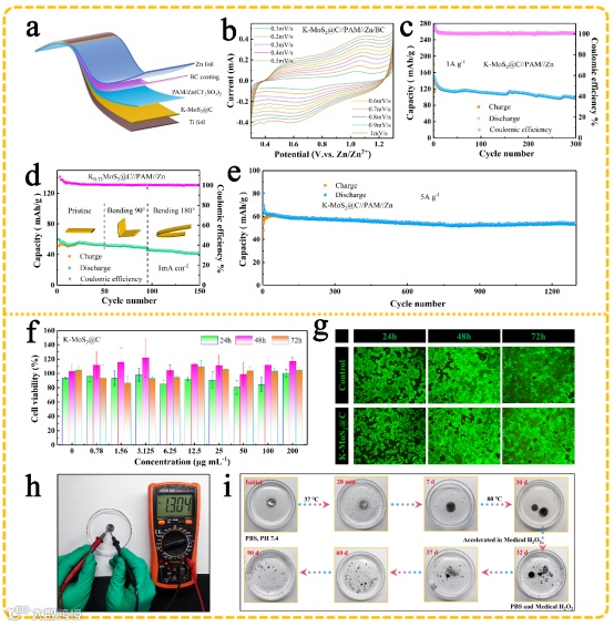 图7 (a) 准固态 ZIB 的示意图;(b) 不同扫速下的CV曲线;(c) 1 A g-1 时的循环性能;(d) 1 mA cm-2 时不同弯曲角度下的循环性能;(e) 5 A g-1 时的循环性能;(f)不同浓度K-MoS2@C与细胞共同培养后的存活率;(g) 细胞与 K-MoS2@C 共同培养后的荧光图像;(h) 准固态ZIB器件工作电压的光学图像;(i) 准固态ZIB 器件在 37 ℃ 和 80 ℃ 下浸泡在 PBS 中的溶解照片。