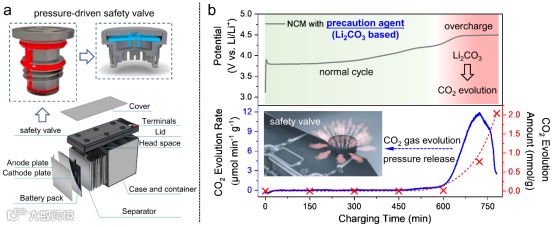 图5 (a)压力驱动安全阀的电池组结构示意图。(b)从含9wt%Co-Li2CO3的NCM-811半电池的充电过程中采集的原位OEMS。循环的正常工作电压≤4.2V(绿色区域),然后是过充(红色区域)。CO2的速率和释放量如下图所示。CO2在顶部空间的积累导致压力升高,最终触发安全阀释放CO2并及时切断电源。