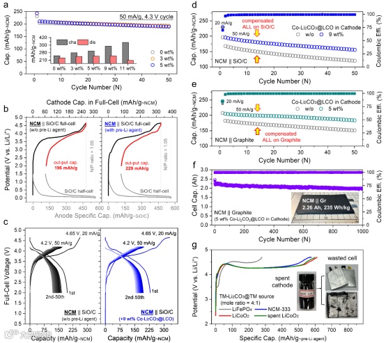 在全电池结构中,为了提高安全性和延长循环寿命,负极的容量略微过剩是必要的。此外,采用相同尺寸的正极片和负极片也是最佳选择。然而,在实验室规模的纽扣电池中,N/P比(N/P代表负极/正极的容量)以及正极和负极片的排布很难控制。因此,在NCM-811||Gr软包电池中添加了5wt%Li2CO3@LCO(图4f)。补锂后电池的质量能量密度达到235Wh/kg,总容量为2.26Ah。更重要的是,它具有卓越的循环稳定性,1000次循环后容量保持率为88%。