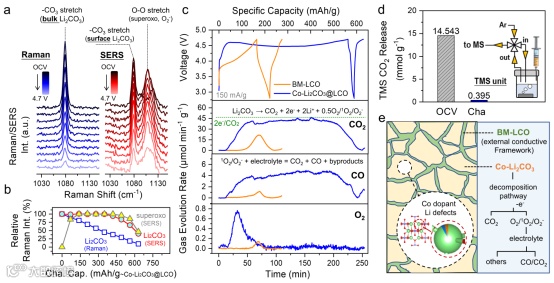图3(a)Co-Li2CO3@LCO的电化学原位拉曼光谱(蓝线)和SERS(红线)光谱。(b)充电过程中容量与Li2CO3的拉曼光谱、Li2CO3的SERS谱和超氧化物(O-O)的SERS谱(相对强度相关关系图。(c)在初始循环和第二次充电过程中采集的Li2CO3@LCO和BM-LCO原位OEMS。(d)Li2CO3在初始和充电状态下的定量TMS。插图为与TMS相关的设备。(e)通过晶格工程实现Co-Li2CO3@LCO电化学分解的示意图。