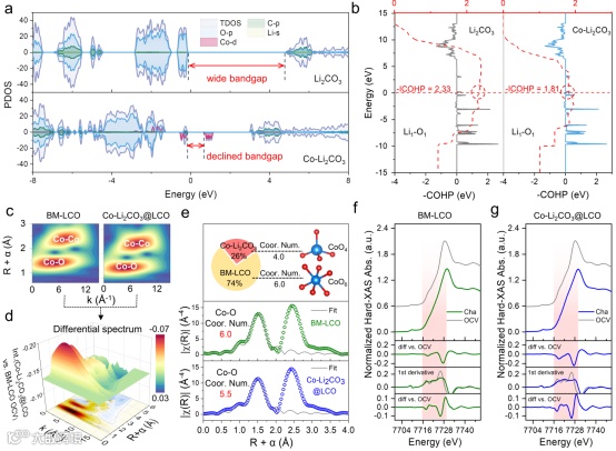 图2(a)基于Li2CO3和Co-Li2CO3的Li-s、C-p、O-p、Co-d的总态密度(TDOS)和投影态密度(PDOS)。(b)基于Li2CO3和Co-Li2CO3的Li1-O1键的COHP/-ICOHP。(c)初始状态下BM-LCO和Co-Li2CO3@LCO WT-EXAFS光谱。(d)初始状态下Co-Li2CO3@LCO与BM-LCO的彩色3D WT-EXAFS微分光谱。(e)Co-Li2CO3@LCO中Co-O配位数(CN)分别为6.0和4.0的Co摩尔百分比饼图。基于BM-LCO和Co-Li2CO3@LCO的初始状态下,Co-O壳层在R空间中的Co K边EXAFS拟合结果如下图所示。(f-g)Co K边XANES,一阶导数谱及其差谱,分别基于(f)BM-LCO和(g)Co-Li2CO3@LCO(Cha vs. OCV)。