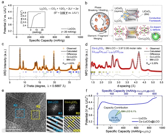 通过晶格工程实现Co-Li2CO3@LCO电化学分解的示意图如图3e所示。通过球磨成功实现了建筑学和晶格工程。在建筑学方面,利用粉化和缝合效应来构建复合结构。BM-LCO可作为外部导电框架,从而改善整体电子传输动力学。在晶格工程中,局部高温和压力效应将Co掺入Li2CO3的晶格中,从而得到Co-Li2CO3。这种缺陷态的掺Co结构将Li2CO3的固有特性从具有宽带隙的绝缘体转变为具有合适带隙的半导体。由于带隙减小和Li-O键强度减弱,Co-Li2CO3可以在适当的电压范围内分解。此外,Li2CO3分解路径按照Li2CO3→CO2+2e-+2Li++0.5O2/1O2/O2-的步骤进行。