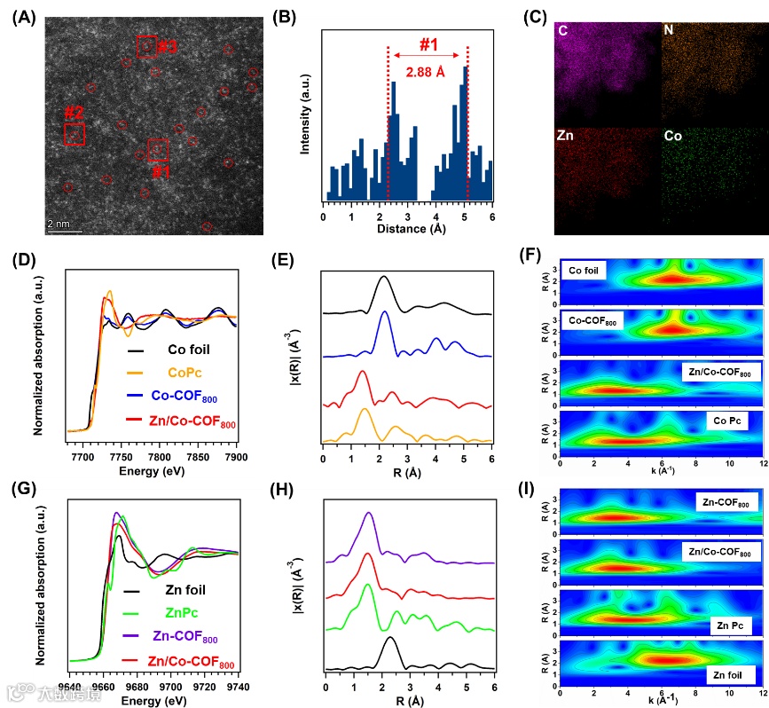 利用高角度环形暗场扫描透射电镜(HAADF-STEM)确定了C-Zn/Co800中金属原子的原子分布。