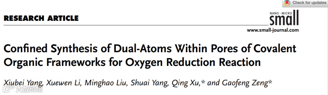 近日,来自中国科学院上海高等研究院曾高峰研究员、徐庆副研究员团队,在国际知名期刊Small上发表题为“Confined Synthesis of Dual-Atoms Within Pores of Covalent Organic Frameworks for Oxygen Reduction Reaction”的观点文章。展示了一种基于COFs的限域合成双原子催化剂的策略。由于在共价有机框架(COFs)的孔隙中原位合成了沸石咪唑酸骨架,因此在热解过程中金属原子的迁移和聚集得到了充分的抑制。该催化剂含有丰富的Zn-Co双原子位,具有较高的氧还原反应活性,半波电位为0.86 V,优于商业Pt/C催化剂。