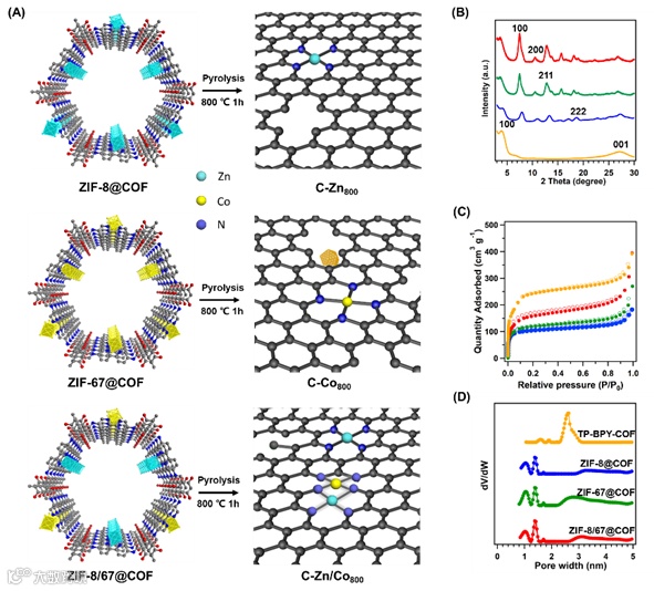 图1. (A) C-Zn800、C-Co800和C-Zn/Co800催化剂的合成过程示意图及相关表征。