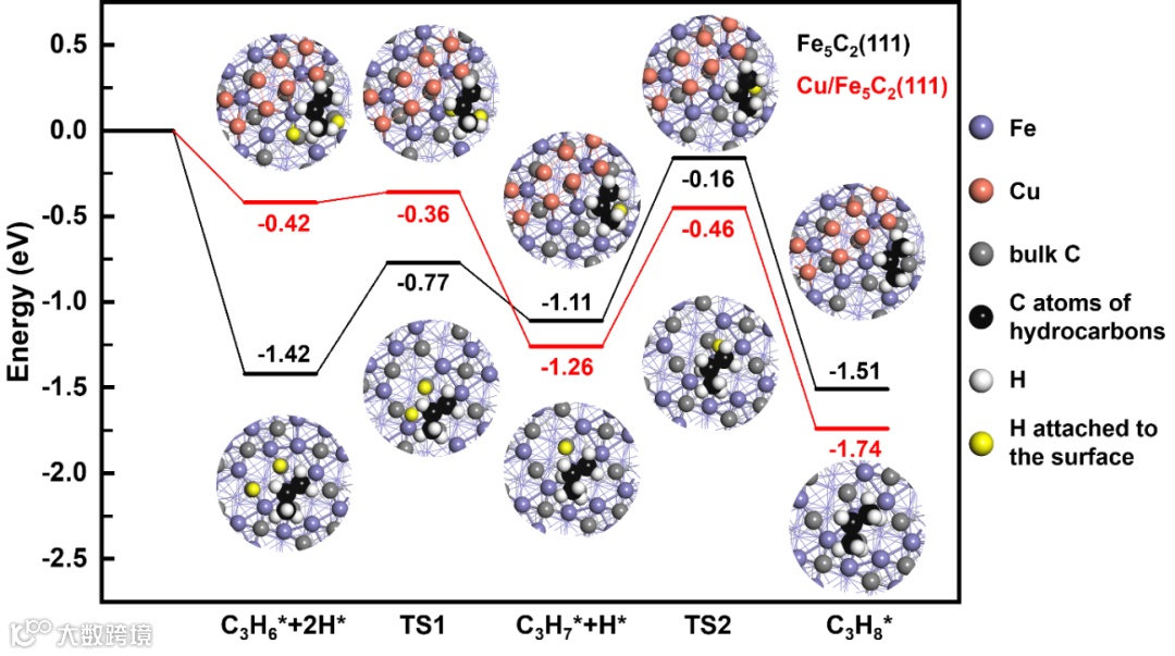 图3. 丙烯在Fe5C2(111)和Cu/Fe5C2(111)表面氢化成丙烷的反应途径
