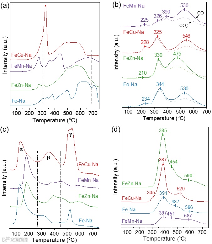图1. (a) H2-TPR;(b) CO-TPR;(c) CO2-TPD;(c) CO2-TPD