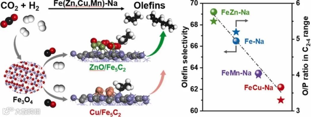 一方面,过渡金属可以作为结构助剂提升催化剂的稳定性;另一方面,过渡金属助剂可通过改变铁物相的电子密度来改善其还原和碳化能力并促进反应过程中碳物种的吸附。然而,过渡金属助剂对铁基催化剂性能的影响仍存在争议,此外,关于过渡金属助剂对烯烃选择性的影响也缺乏理论上的认识。